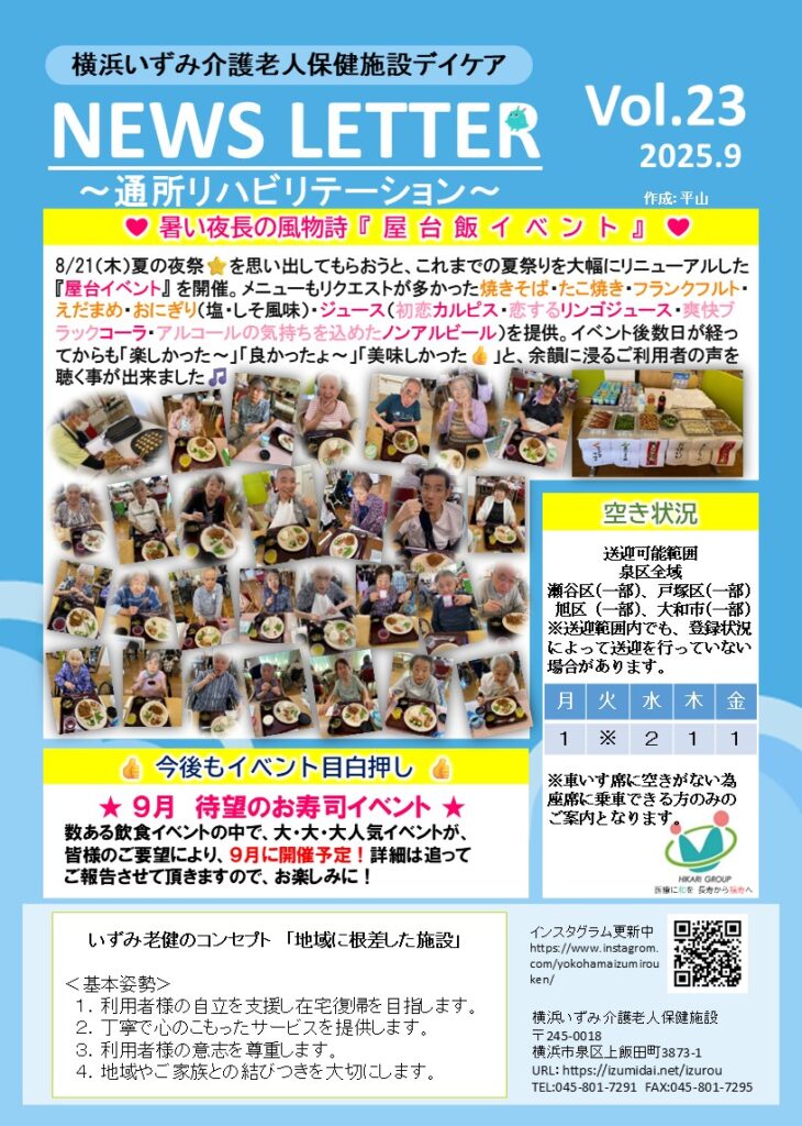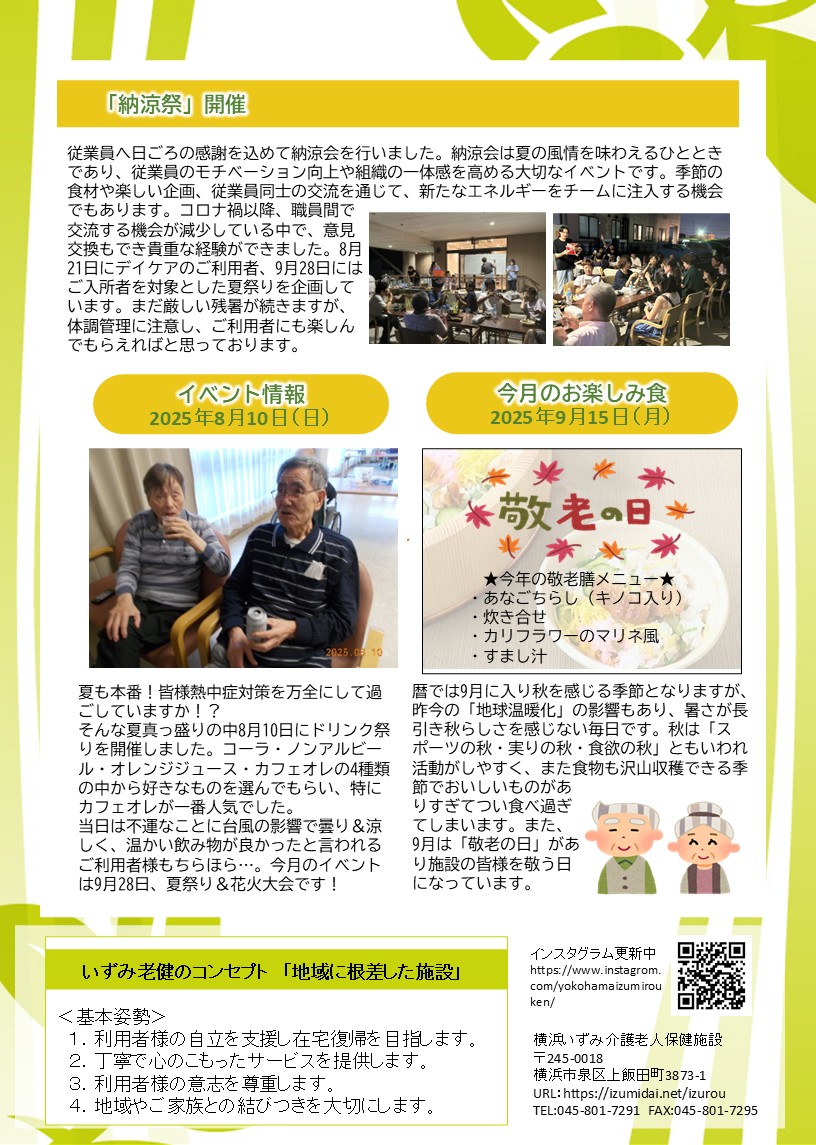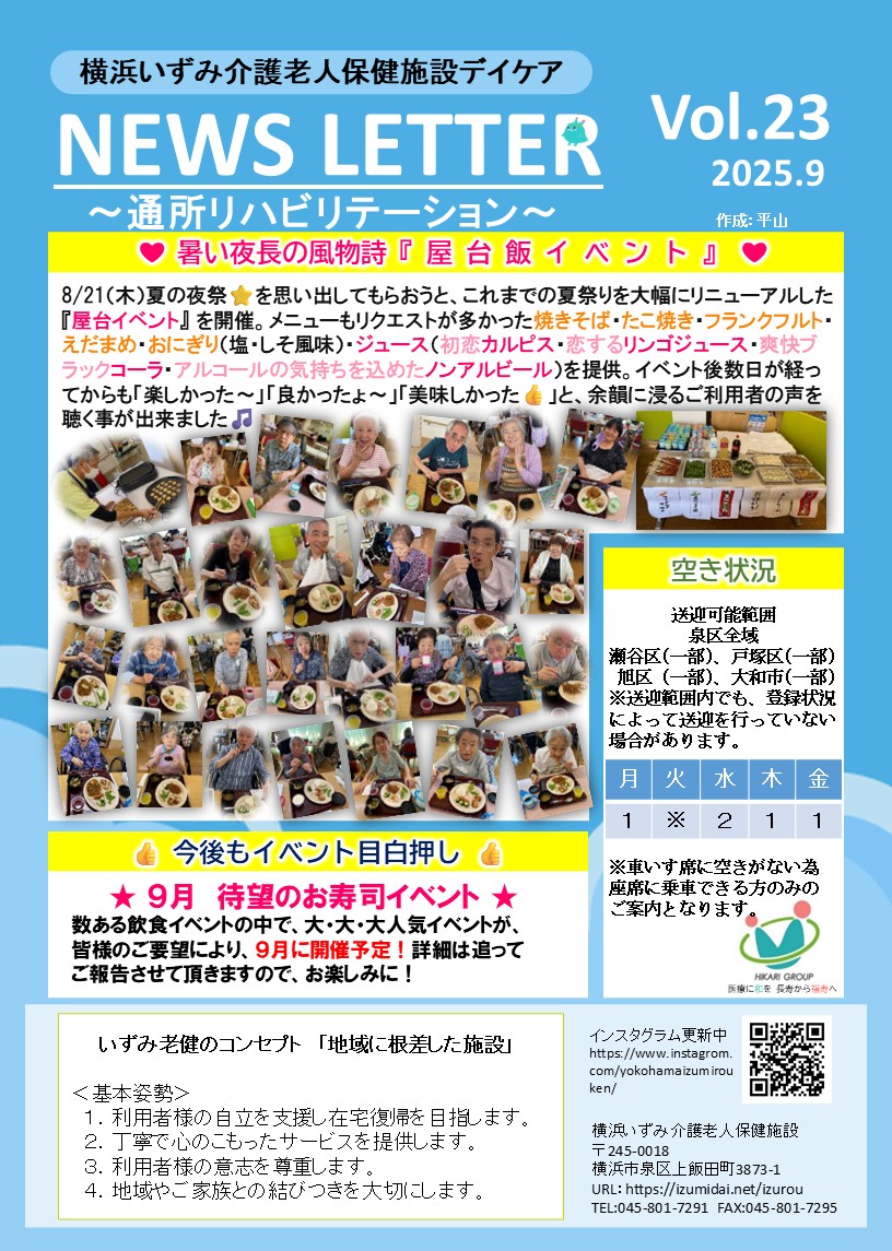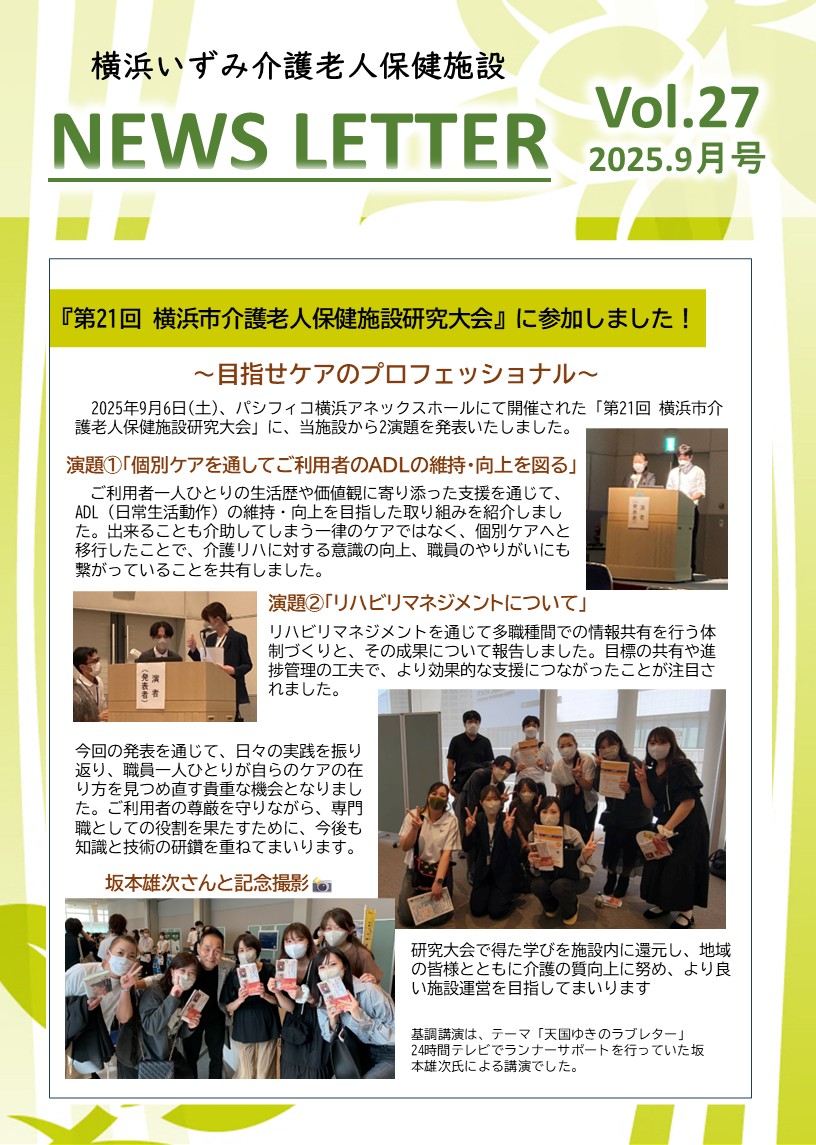 「NEWS LETTER」vol.27 いずみ老健 2025.09.17 9月のNEWS LETTERです! 今月は、先日開催された「横浜市介護老人保健施設研究大会」の様子をお届けします。当施設からは2演題、日々の実践を振り返り、職員一人ひとりが自らのケアの在り方を見つめ直す貴重な機会となりました。今後も、ご利用者の尊厳を守りながら、専門職としての役割を果たすために、今後も知識と技術の研鑽を重ねてまいります。月1回、毎月10日発行予定です。