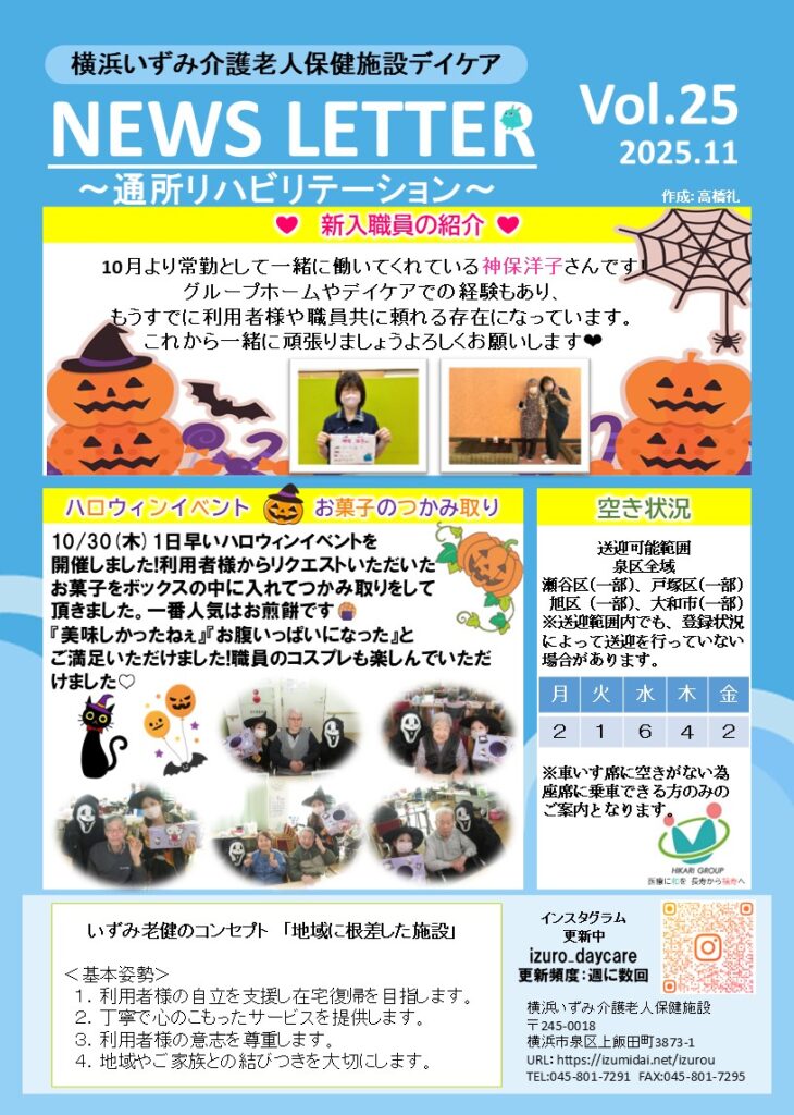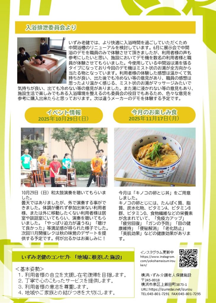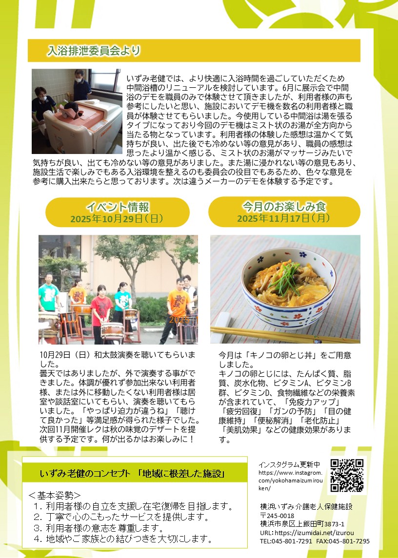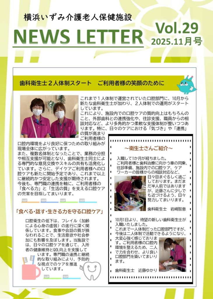 「NEWS LETTER」vol.29 いずみ老健 2025.11.07 11月のNEWS LETTERです! 10月より新体制となった口腔ケア部門のご紹介です。これまで入所の皆さまを対象としていた口腔ケアに加え、今後はデイケアご利用者様への支援も開始する予定です。「食べる力」「話す力」「生きる力」を支える取り組みとして、より充実したケアを提供してまいります。 月1回、毎月10日発行予定です。