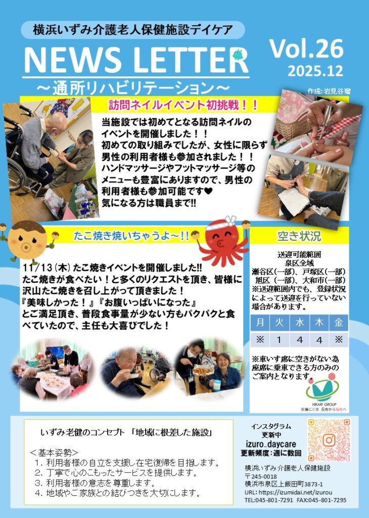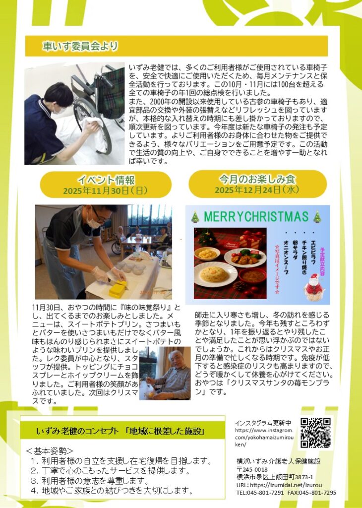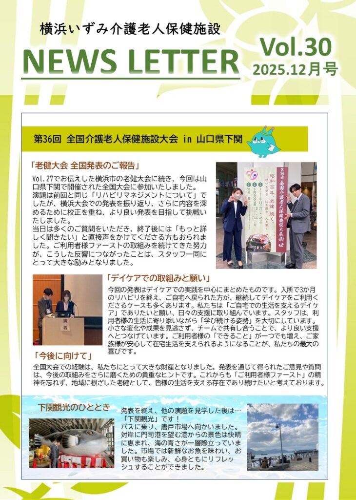「NEWS LETTER」vol.30 いずみ老健 2025.12.16 12月のNEWS LETTERです! 全国老健大会に行ってきました!開催場所は山口県下関市。初めての下関で発表はもちろんですが、観光もめいいっぱい楽しんでまいりました。デイケアも新しいイベントが目白押しです。楽しんで過ごしていただけることを常に願っております。 月1回、毎月10日発行予定です。